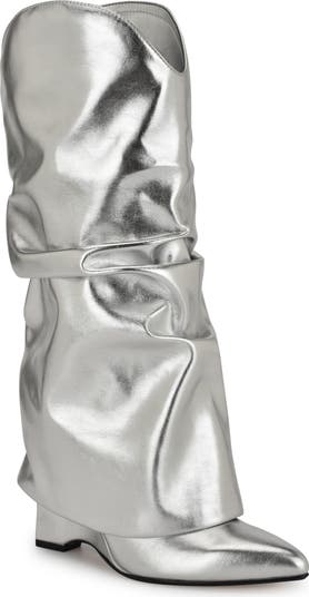 A slouchy fold-over shaft creates contemporary intrigue on a statement-making boot balanced by a pointy toe and sculptural wedge heel.
