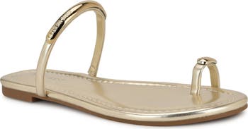 Lustrous hardware adorns the tubular instep strap and toe loop on a minimalist faux-leather sandal that will flawlessly complement your warm-weather looks.