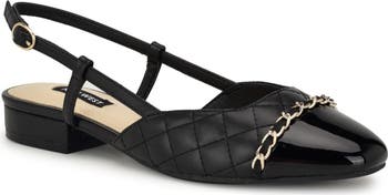 Chain-link hardware trims the cap toe on a stylish slingback pump lifted by a modest block heel.