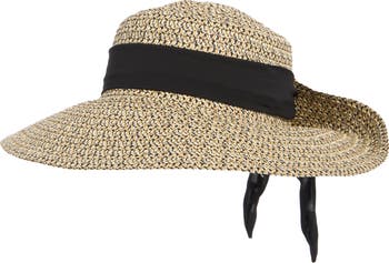 Picnics and garden parties are complete with this outfit-perfecting sun hat crafted from artfully woven straw and finished with an upturned back brim popped with an oversized bow.