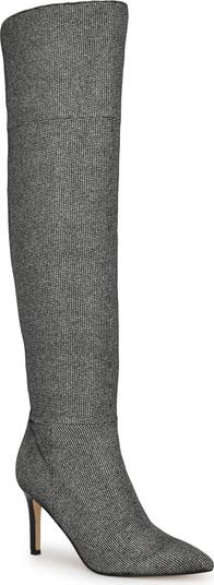 A pointy toe and tapered heel balance a luxe boot shaped in an over-the-knee silhouette for scene-stealing appeal.