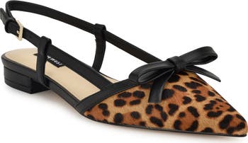 Leopard-spotted calf-hair adds an extra flash of personality to a pointy-toe flat complete with a classic slingback strap.