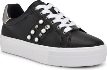 A metallic collar and pearlescent studs charm this low-top sneaker elevated by a chunky platform sole.