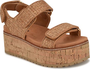 A cork-textured platform and woven straps amplify the earthy style of this weekend-ready sandal.