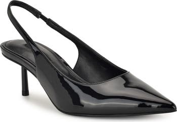 A pointy toe and elasticized slingback strap create a streamlined profile on a glossy faux-leather pump lifted by a subtle pin heel.