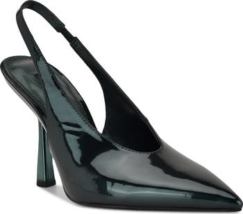 A high-cut topline and pointy toe add crisp angles and striking dimension to a glossy faux-leather pump featuring a sculptural heel and elasticized slingback strap.