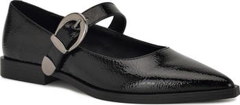 Exude polished style in this shiny faux-leather mary jane boasting a sleek pointed toe and an adjustable strap framed by gleaming hardware.