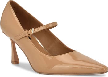 An adjustable mary jane strap provides a secure fit and retro aesthetic on a glossy pump featuring a snip toe and svelte flare heel for sculptural intrigue and balance.