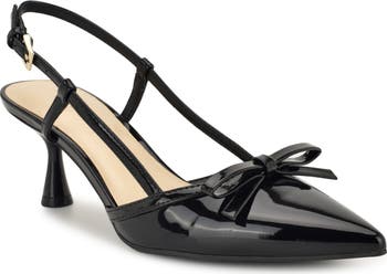 An of-the-moment kitten heel lends chic style points to a signature pointy-toe pump shaped from faux leather with a glossy finish.