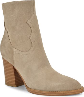 A pointy toe and stacked block heel balance a versatile bootie fashioned with a side zipper for easy entry.