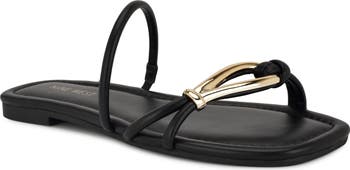 Geometric hardware glints against the tubular faux-leather straps of a weekend-ready slide sandal fashioned with an angular square toe.