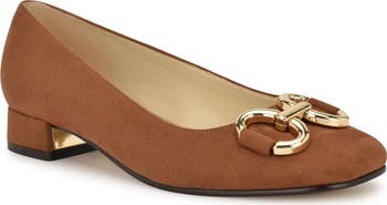 Gleaming bit hardware enriches the vamp of a poised leather pump framed by a square toe and mini block heel.