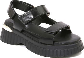 Boost your sunny-day style with this chunky platform sandal framed by adjustable hook-and-loop straps and gleaming metallic trim.