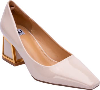 A striking tapered toe and metal-framed block heel shape the bold silhouette of this bold pump bringing edgy sophistication to any wardrobe.