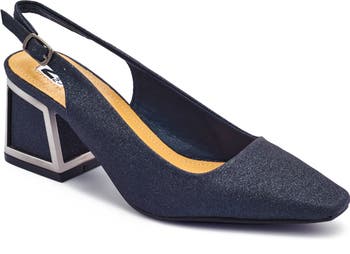 A striking tapered toe and metal-framed block heel shape the bold silhouette of this slingback pump bringing edgy sophistication to any wardrobe.