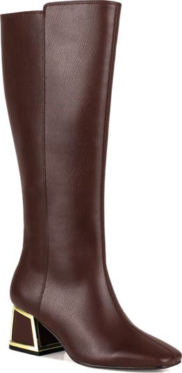 A striking tapered toe and metal-framed block heel shape the bold silhouette of this knee-high boot bringing edgy sophistication to any wardrobe.