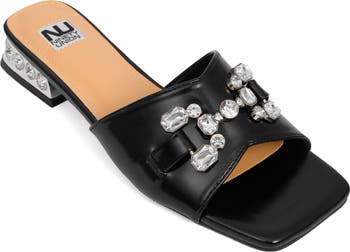 Glistening crystal embellishments and chain detailing add a luxurious touch to this sandal designed with a flared heel and squared-open toe.