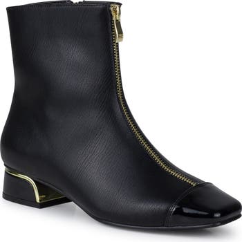 A square toe and exposed front zipper frames the bold silhouette of this block-heel boot, bringing edgy sophistication to any wardrobe.