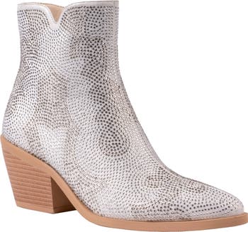 Show off glam sparkle with this rhinestone-embellished bootie fashioned with a pointed toe, easy side-zip closure and stacked block heel.