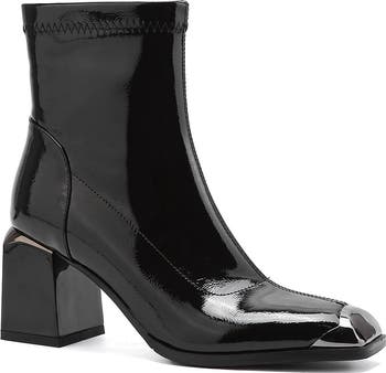 A metal-tipped, square tapered toe frames the bold silhouette of this block-heel boot finished with a liquid-like finish, bringing edgy sophistication to any wardrobe.