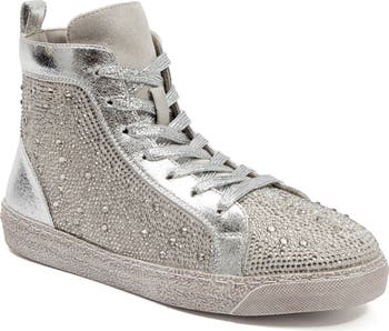 A high-top sneaker encrusted with rhinestones adds sparkle and shine to your everyday ensemble.