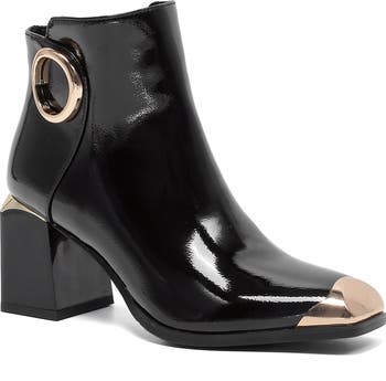 Gleaming hardware adds modern glamour to this squared-off cap-toe bootie with a chic patent finish and a side zipper for easy entry.