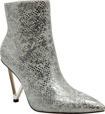 A triangular heel punctuates a pointed-toe bootie fashioned with snakeskin-embossed or leopard printed panels for chic style.