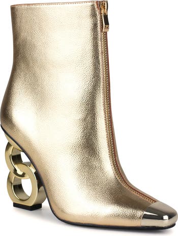 A square toe and exposed front zipper frames the bold silhouette of this ankle-high boot fit with a linked ring heel, bringing edgy sophistication to any wardrobe.