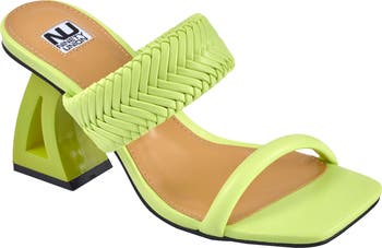 A blocky architectural heel amps up the style points of a party-ready slide made modern by a squared toe.
