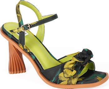 Bring the garden to the party with this enchanting floral ankle-strap sandal framed by a knotted bow and lifted by a sculptural, wood-inspired block heel.