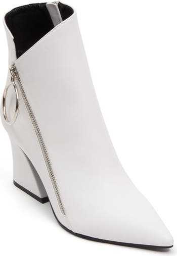 A demi block heel brings striking flair to this pointed-toe bootie styled with a glossy side zipper accented by an oversized O-ring pull for extra edge.
