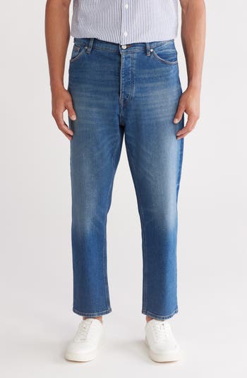 Go casual in these high-waisted button-fly jeans cut in a tapered fit from soft cotton-blend stretch denim.