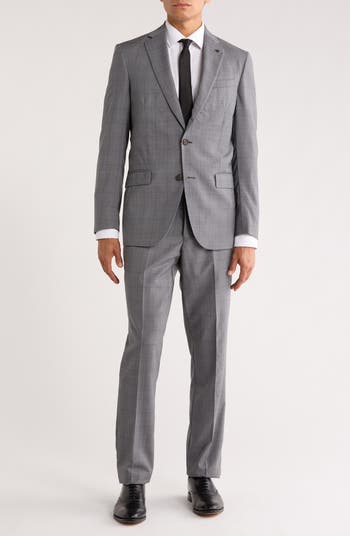 Subtly textured wool styled in a grey windowpane print distinguishes a suit tailored with padding in the shoulders and fitted in the waist for a smart, streamlined look. The flat-front trousers sit above the hips and complement the traditional detailing to keep the silhouette crisp and clean.