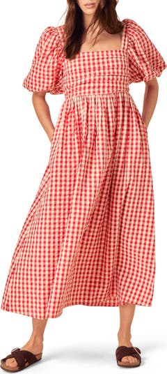 Voluminous puff sleeves and a flared skirt sweeten the silhouette of this linen-blend midi made with a smocked back for easy movement. A pleated bodice and classic gingham enhance its summery charm.