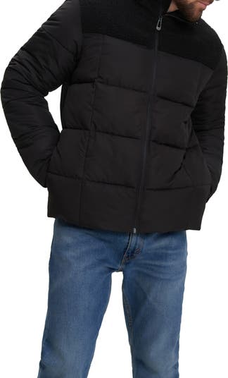 A faux-shearling trim accents this long-sleeve puffer jacket with a cozy stand collar for cuddly comfort.