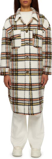 Get cozy in this soft felted shirt-jacket constructed in a slouchy, longline silhouette with a plaid print, chest flap pockets and a curved hem.