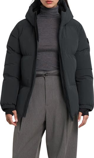 Stay cozy in this water-resistant hooded puffer jacket constructed with thumbhole cuffs, secure zip pockets and warm channel-quilted recycled insulation.