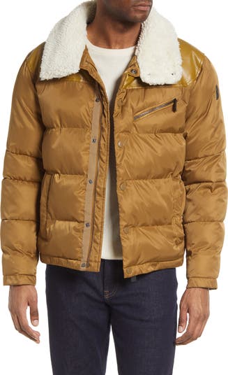 A plush high-pile fleece lining brings snuggle-ready style to this quilted puffer jacket that's detailed with a glossy faux-leather yoke.