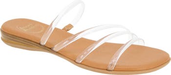 A comfort-cushioned footbed keeps your vacation-ready look comfortable in a breezy sandal shaped by slim, asymmetrical straps.