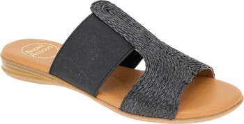 A woven raffia upper secured by a stretchy gore strap ensures a comfortable fit in this summery slide sandal grounded by a comfort-cushioned footbed.