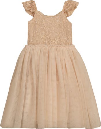 A floral lace bodice and ruffled lace sleeves add adorable detail to a picture-perfect dress crafted from soft cotton-blend fabric.
