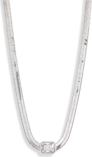 A single bezel-set cubic zirocnia shines in an emerald cut at the center of this fluid snake chain necklace.