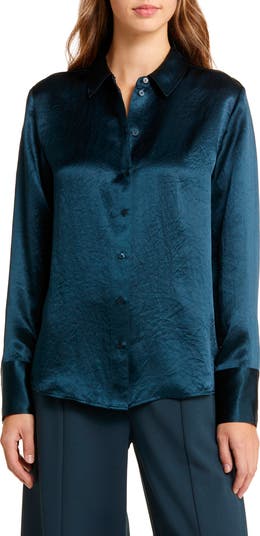 A lustrous satin finish gets a casually crinkled treatment to create a button-up shirt that's easy to style up or down.