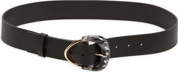 A mix of marbled acrylic and goldtone makes up the buckle of this classic leather belt that will add a perfect focal point to minimalist looks.
