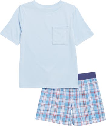 A pajama shirt made entirely of recycled fibers pairs with lightweight plaid shorts to take your kid from sweet slumber to lazy days and back in dreamy comfort.