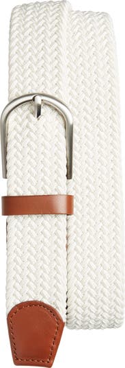 Braided elastic cording brings stretchy comfort to a belt trimmed in leather accents and cinched with gleaming buckle hardware that fastens anywhere along the belt length to secure a perfect fit.