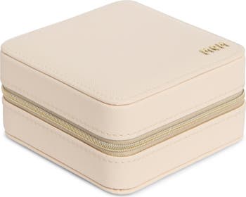 A lovely gift, this square travel jewelry box features dainty 'Mom' hardware on the lid and convenient spaces for necklaces, earrings and rings.
