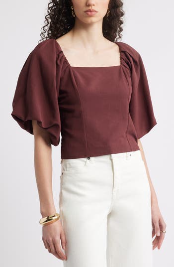 Voluminous puff sleeves make a statement on a lightweight linen-enriched top that's fashioned with a sophisticated square neck.