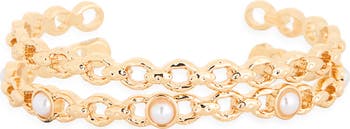 Finish your look with the sparkle of this set of cuff bracelets molded from a link chain and finessed with cabochon faux pearl beads.