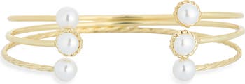 A trio of smooth and textured open-cuff bracelets adorned with faux pearls can be stacked to create the perfect caged-wrist look.